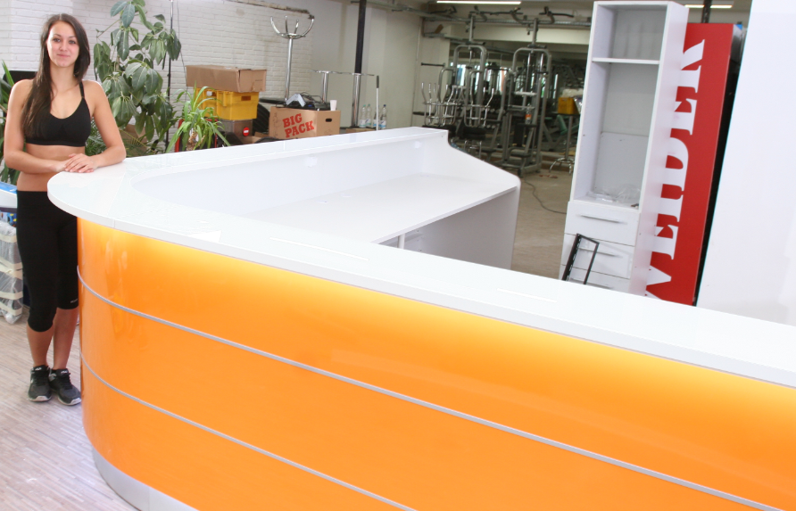 Neue orange Hochglanz - Empfangstheke für den Fitnesskettenbetreiber Day and Night Sports mit einer weiterem Filiale in Saarbrücken